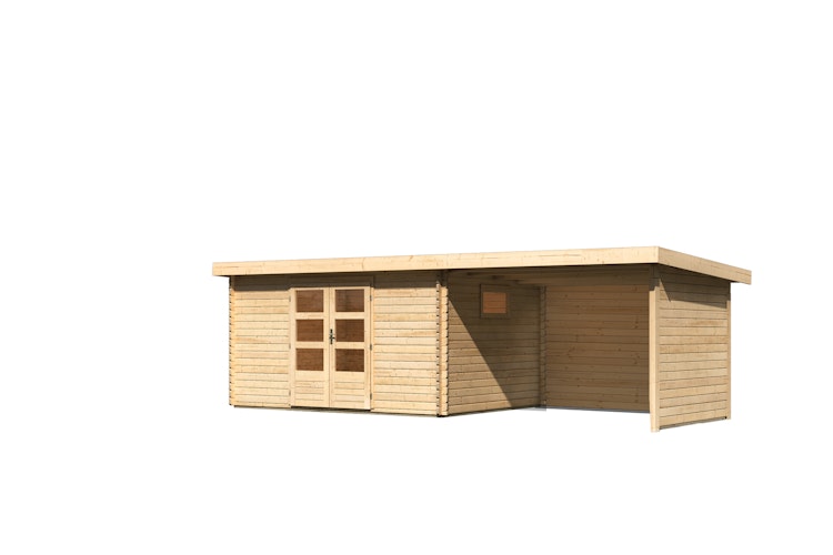 Karibu Woodfeeling Gartenhaus Trittau 3/4/5 inkl. 300 cm Anbaudach - 38 mm. Dieses massive Gartenhaus trotzt, dank der 38 mm Blockbohlen, auch extremen Witterungsbedingungen. Inkl. Massivholz-Pultdach, Doppelflügeltür, sowie einem feststehenden Fenster mit Kunstglas. Bei diesem Set ist ein 300 cm breites Anbaudach (optional mit Seiten- und Rückwand) inklusive.