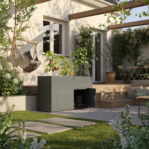 Das Hochbeet UrbanGrow L-Space in elegantem Anthrazit (RAL 7016) bietet mit seinen Maßen von 1,59 m x 0,51 m x 0,86 m kompakte Robustheit dank verzinktem Stahl und Edelstahlschrauben. Mit zusätzlichem Stauraum inkl. 2 Türen ist es ideal für Hobbygärtner.