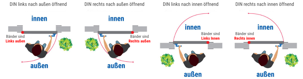 (bitte beachten Sie, dass nach außen öffnende Türen eine höhere Dichtigkeit, aber einen geringeren Einbruchschutz aufweisen)