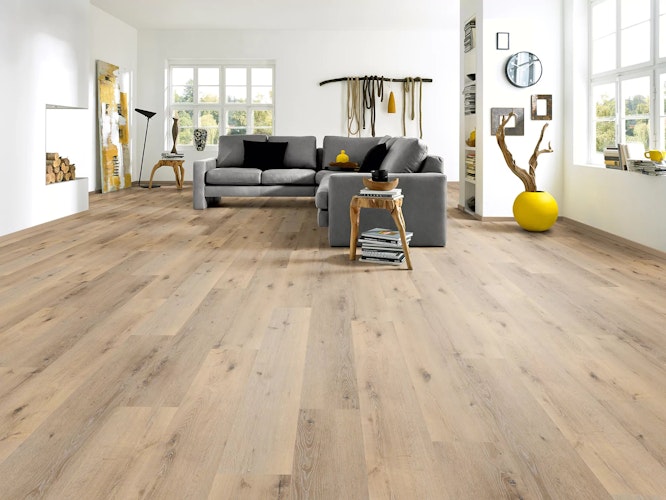 Der KWG Trend Synchrony Premiumeiche cappuccino Designboden Solidtec (121,8 x 22,6 cm) bietet eine edle Eichenoptik im sanften Cappuccino-Ton. Die wasserfeste Solidtec-Kompaktträgerplatte sorgt für Strapazierfähigkeit und Robustheit. Ideal für alle Wohnbereiche.