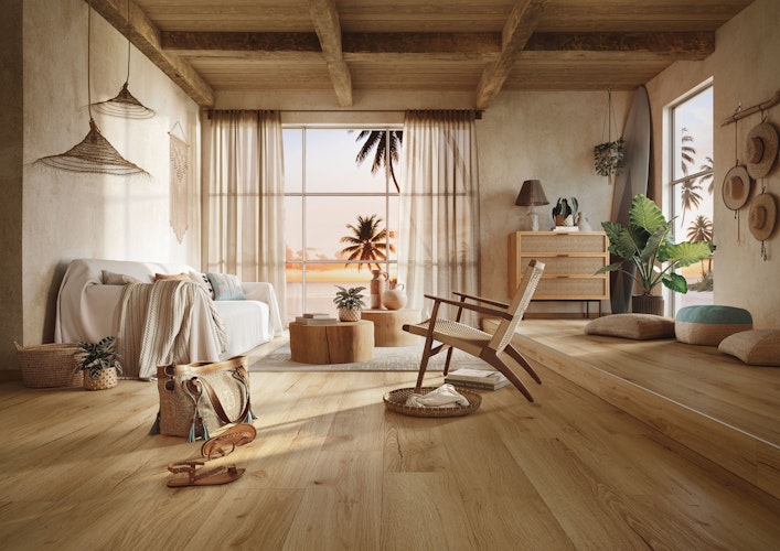 Der MEISTER Designboden Dryback-Vinyl DD 155 Sunset Lounge 20081 bietet eine authentische Holzoptik mit einer natürlichen Wood-Struktur und umlaufender Microfase, die für eine harmonische Optik sorgen. Die großzügige Nutzschicht von 0,55 mm in Kombination mit der matten PUR-Lackierung macht den Boden besonders widerstandsfähig, pflegeleicht und langlebig.
