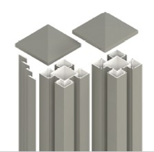 2 Aluminiumpfosten, 4 Nut-Abdeckleisten Aluminium, 4 Pfostenkappen, Pfostenankerbefestigung und Gummipads (farbeinheitlich)