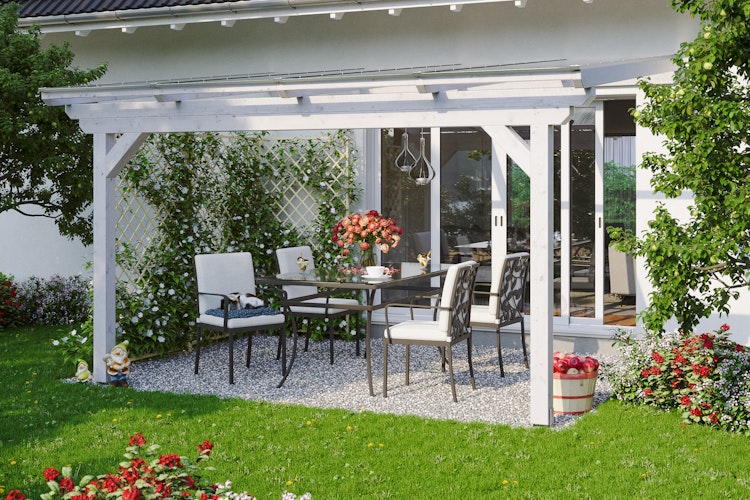 B-Ware Skan Holz Terrassenüberdachung Ancona 434x250cm weiß aus Leimholz inkl. Wandanschluss-Profilset und Wandbefestigungsset