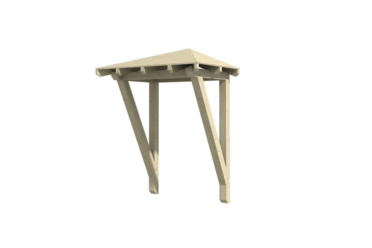 Das Skan Holz Walmdach Vordach Wesel bietet Schutz vor jeglichen Witterungsbedingungen. Technisch getrocknetes, keilverzinktes und endlos verleimtes Massivholz, Risse, Äste und leichte Verdrehungen widerspiegeln den Charakter der eingesetzten Materialien.
