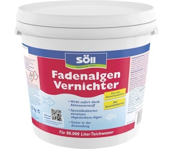 Algen sind für einen funktionierenden Gartenteich unerlässlich. Sie produzieren Sauerstoff und sind ein wichtiges Glied in der Nahrungskette. Sie müssen aber etwas unternehmen, wenn Ihr Gartenteich starken Algenwuchs aufweist. Denn ungebremstes Wachstum senkt die Karbonathärte und lässt den pH-Wert schwanken. Die Anti-Algenprodukte von Söll wirken gegen alle Algenarten und führen das Algenwachstum auf ein normales Maß zurück. Für klare, schöne Teiche. FadenalgenVernichter zerstört durch die sofortige Freisetzung von aktivem Sauerstoff selbst hartnäckigste Fadenalgen innerhalb von 24 Stunden. Bereits kurz nach der Anwendung können die abgestorbenen Algen abgekeschert werden. Verbleibende Algenreste werden durch die enthaltenen Spezialbakterien beschleunigt zersetzt. FadenalgenVernichter ist farblos und hochwirksam. Der Wirkstoff wird in wenigen Stunden zu Wasser und Sauerstoff abgebaut.