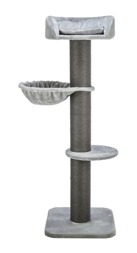 Der Trixie Kratzbaum für Katzen hat eine Grundfläche von 58 x 58 cm, eine Höhe von 173 cm und besteht aus plüschigem Polyester, Sisal und Kunststoff.
