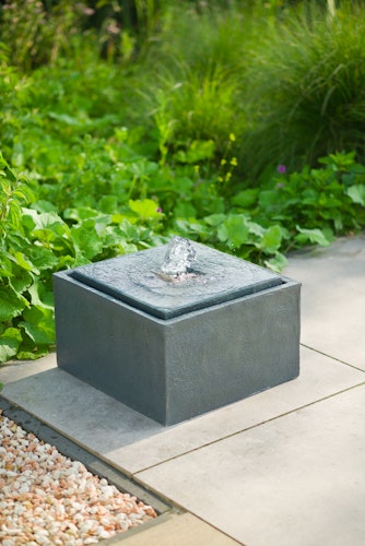 - Modernes, anthrazitfarbenes Wasserspiel mit klarer Linienführung