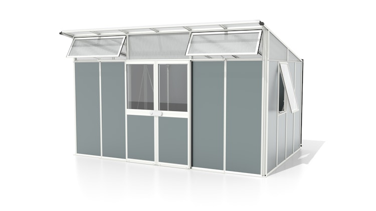 - Doppelrahmenprofile aus Aluminium, robuste Alu-Sandwichpaneele in den Seiten, Einscheibensicherheitsglas, kristallklar (ESG) in den Fenstern und im Lichtband, HKP mit 10mm Stärke im Dach