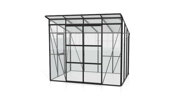 Das Modell ist in schwarz oder Aluminium-blank erhältlich. Die Verglasung besteht aus hochwertigen 6 mm Hohlkammerplatten oder 3 mm Einscheibensicherheitsglas.