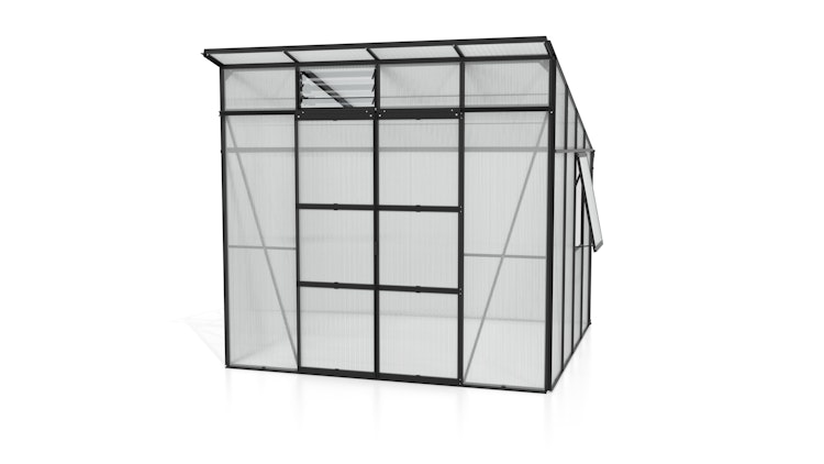 Das Modell ist in Schwarz oder Aluminium-blank erhältlich. Die Verglasung besteht aus hochwertigen 6 mm Hohlkammerplatten oder 3 mm Einscheibensicherheitsglas.