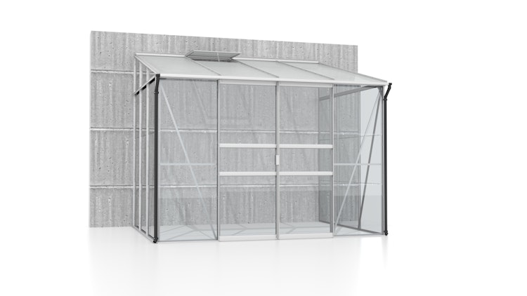 • Schön, hoch und mit breiten Doppelschiebetüren ausgestattetes Anlehngewächshaus