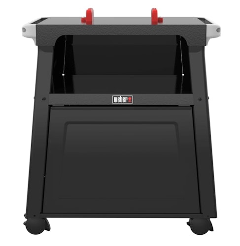 Vollständig geschlossener Schrank mit oben offenem Regal welches über zwei eingebaute Haken verfügt, die die Grillroste halten können. Langlebige Kontruktion, 2 Besteckhaken an den Seiten, Weber Works Schienen für einzuhängendes Weber Works Zubehör (separat erhältlich) und feststellbare Rollen.