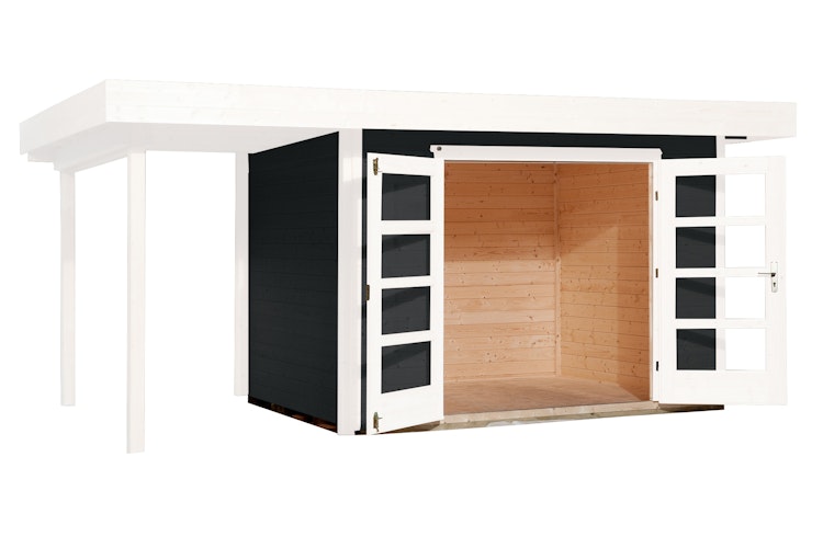 Modernes Weka 28 mm Designhaus 126 A mit seitlichem Anbau (150 cm) inkl. Stützen und Abschlussblende sowie Panorama-Doppeltür. Das Gartenhaus ist Teil der vielfältigen Weka Marlo Serie.