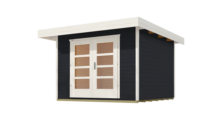 Modernes Weka 28 mm Designhaus 126 mit attraktiven 19 mm Pultdach inkl. 50 cm Vordach und attraktiver Doppelflügel-Panoramatür. Das Gartenhaus ist Teil der vielfältigen Weka Marlo Serie.