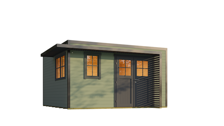 Das Modell in der Größe 400x400 cm und mit einer Wandstärke von 44 mm bietet durch die Doppeltüren einen leichten Zugang und unkompliziertes Verstauen von Geräten. In die Türen integrierte Fenster lassen reichlich Tageslicht herein, und die mitgelieferten Zierleisten können nach Wunsch angebracht werden. Optional kann das Gartenhaus mit zwei zusätzlichen Fenstern bestellt werden.