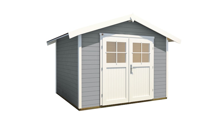 240 x 205 cm (Gr. 1), 240 x 235 cm (Gr. 2), 300 x 205 cm (Gr. 3), 300 x 235 cm (Gr. 4), 300 x 295 cm (Gr. 5) - 16 mm Massivholz-Satteldach