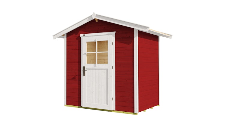 Kompaktes 21 mm Weka Gartenhaus 223 mit Einzeltür, 16 mm Satteldach und 16 mm Massivholz-Fußboden. Das Gartenhaus ist Teil der vielfältigen Weka Blackmount Serie.