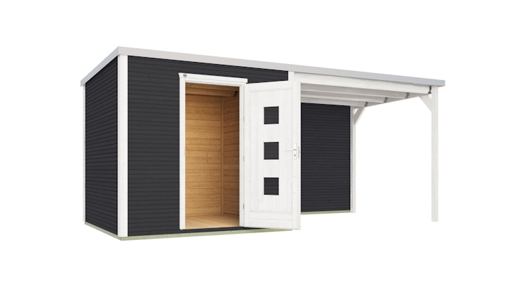 Schickes Flachdach Design-Gartenhaus 413 B inkl. 300 cm Anbau mit Rückwand, elegantem Bohlenprofil, 45 mm Wandstärke und hochwertiger, selbstklebender Dachbahn mit Aluminiumabschlussprofilen sowie einer besonders hohen Eingangstüre (195 cm lichtes Maß). Extravagant und nützlich zugleich! Das Gartenhaus ist Teil der vielfältigen Weka Wekaline Granby Serie.
