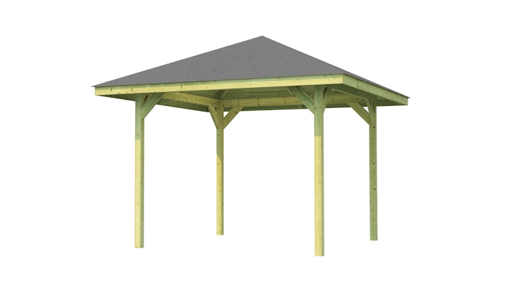Die Konstruktion dieser  Gartenlaube besteht aus 90 x 90 mm starken Massivholzpfosten. Stabile Dachpfetten und Längssparren sorgen für extra Sicherheit und Stabilität.