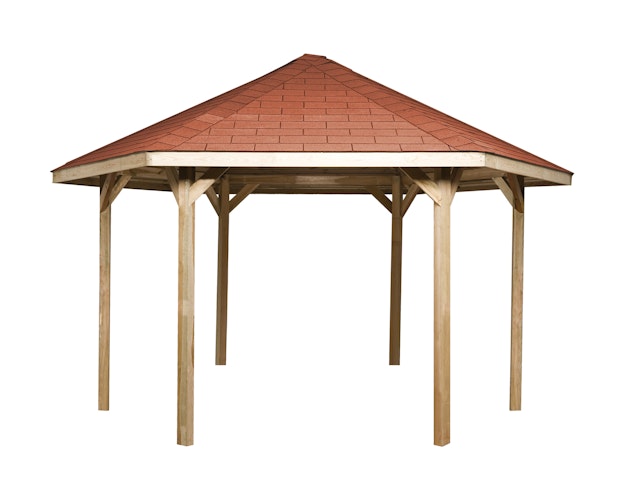 Romantische Weka 6-Eck Pavillon 656 mit 19 mm Massivholzdach im günstigen Sparset inkl. roten, rechteckigen Dachschindeln