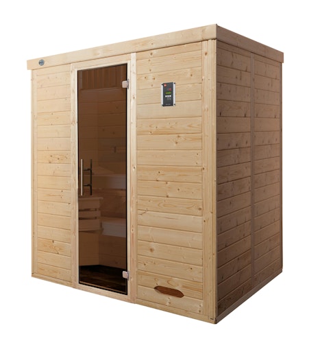 | Grundausstattung | 2 stabile Liegen (55 cm tief) 1 Kopfstütze 1 Ganzglastür Rückenlehnen Liegenblende 1 Ofenschutzgitter aus Fichtenholz 1 hygienische Bodenmatte |