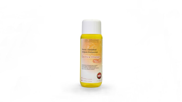 Weka Sauna/Dampfbad-Aufguss-Konzentrate, je Flasche 250 ml Inhalt, ausreichend für ca. 25 Anwendungen (empfohlene Dosierung Sauna: 5–10 ml je Liter Aufgusswasser). Düfte: Eukalyptus, Exotica-Orange, Eislimone, Zirbelkiefer, Marokanische Minze, Kräutermix, Spanischer Salbei, Rosmarin.