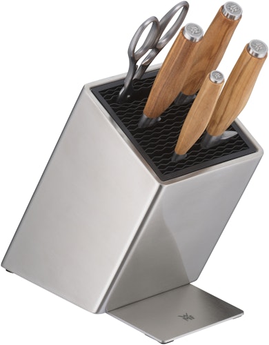 Jeder Messergriff ein einzigartiges Meisterwerk der Natur: Die Griffe aus italienischem Olivenholz der Küchenmesser aus der Kollektion Grand Wood begeistern in der Hand mit warmer Haptik und perfekter Ergonomie. Dabei vereinen sie edle Ästhetik mit hervorragender Schneidleistung und langanhaltender Schärfe. Mit kompromisslosem Qualitätsanspruch bei WMF in Deutschland gefertigt. Der zum 6-teiligen Set gehörende FlexTec Messerblock bietet darüber hinaus für bis zu 15 Messer aller Arten und Formen sicheren Schutz. Das Set besteht aus: einem Kochmesser 20 cm, einem Brotmesser 19 cm, einem Gemüsemesser 9 cm, einem Fleischmesser 20 cm, einer Küchenschere aus Edelstahl und einem FlexTecMesserblock aus Edelstahl.