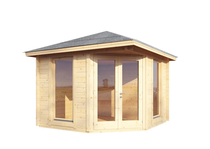 Das Wolff Finnhaus Gartenhaus Katrin 44 ist in 3 verschiedenen Größen, jeweils mit Leimholz Doppeltür und Fenstern, erhältlich. Durch die 5-Eck Bauweise eignet sich das Gartenhaus perfekt für Grundstücksecken.