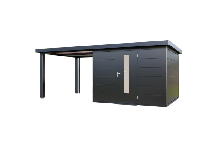 Wolff Finnhaus Premium Metall Gartenhaus Thorin 6030 Anthazit inkl. 300 cm Anbaudach