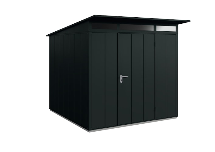 Das Wolff Finnhaus Metallgerätehaus Fascinato 2424 kommt mit moderner Pultdach Optik mit Oberlichtern für einen angenehm hellen Innenraum. Optional kann das Haus mit Einzel- oder Doppeltüre bestellt werden, beide Türen kommen mit sehr hoher Durchgangshöhe (194 cm). Die Lieferung erfolgt inkl. Aluminium-Bodenrahmen, Türfeststeller mit Gasdruckfeder, Regenfallrohr und Edelstahl-Drückergarnitur