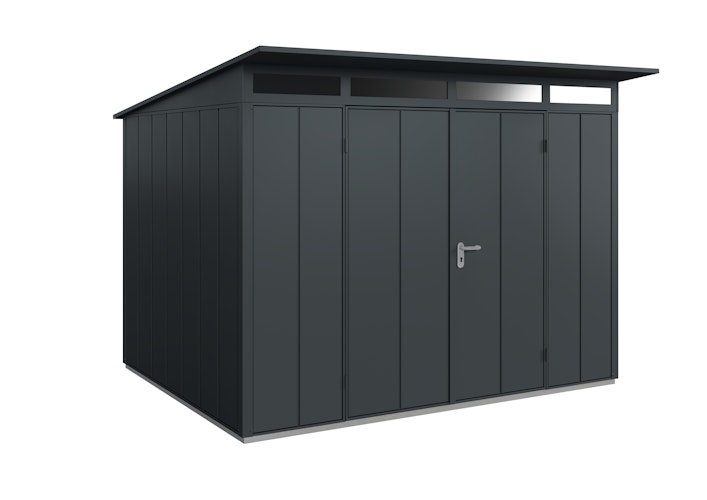 Das Wolff Finnhaus Metallgerätehaus Fascinato 3024 kommt mit moderner Pultdach Optik mit Oberlichtern für einen angenehm hellen Innenraum. Optional kann das Haus mit Einzel- oder Doppeltüre bestellt werden, beide Türen kommen mit sehr hoher Durchgangshöhe (194 cm). Die Lieferung erfolgt inkl. Aluminium-Bodenrahmen, Türfeststeller mit Gasdruckfeder, Regenfallrohr und Edelstahl-Drückergarnitur