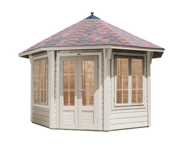 Das geschlossene Wolff Finnhaus Pavillon Capri 3.5 bietet dank der beiden großen Fenster und den Lichtausschnitten in der Türe einen äußerst hellen Innenraum. Die Lieferung erfolgt inkl. schwarzen Dachschindeln, Dachhaube und Edelstahlkugel.